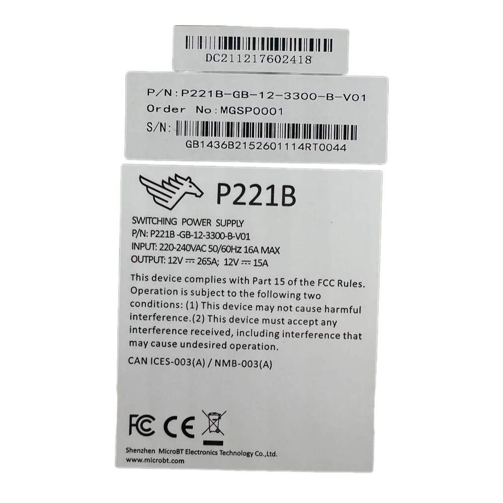 Блок питания P221B Whatsminer — это промышленный импульсный источник питания, разработанный для стабильного и эффективного обеспечения энергией ASIC‑майнеров серии Whatsminer. Он рассчитан на круглосуточную эксплуатацию в условиях высокой нагрузки и соответствует строгим техническим требованиям производителя.