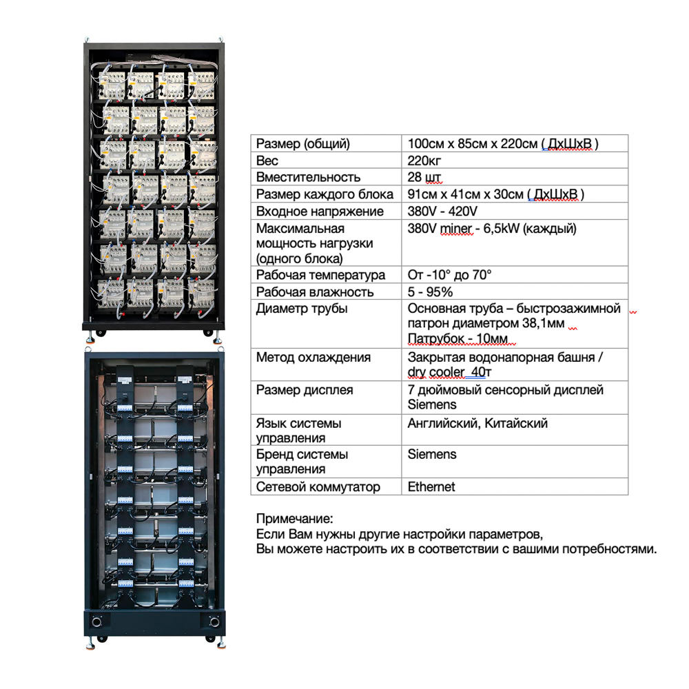 | Максимальная мощность нагрузки (одного блока) | 380V miner — 6,5kW (каждый) |