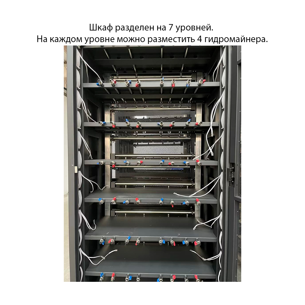 Шкаф разделен на 7 уровней. На каждом уровне можно разместить 4 майнера. Технические характеристики компактны и разумны. Он специально разработан для antminer Hydro, чтобы максимально эффективно использовать пространство.