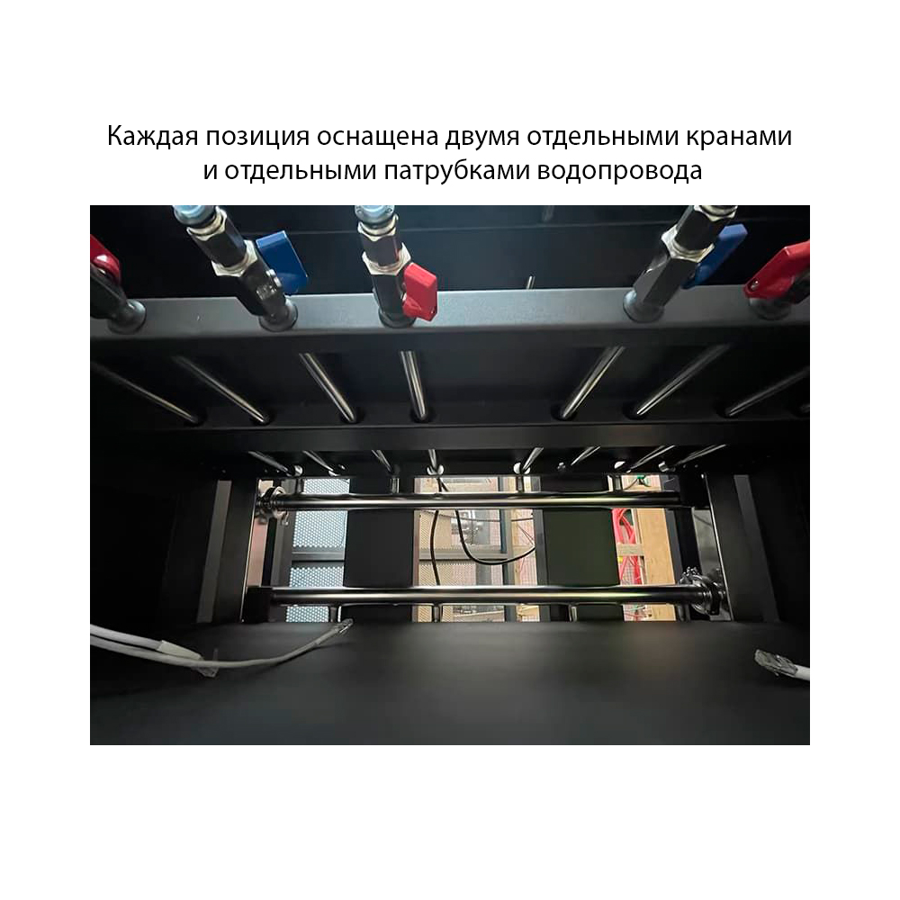 Каждая позиция оснащена двумя отдельными кранами и отдельными патрубками водопровода для обеспечения эксплуатационной независимости и равномерного распределения источников воды.
