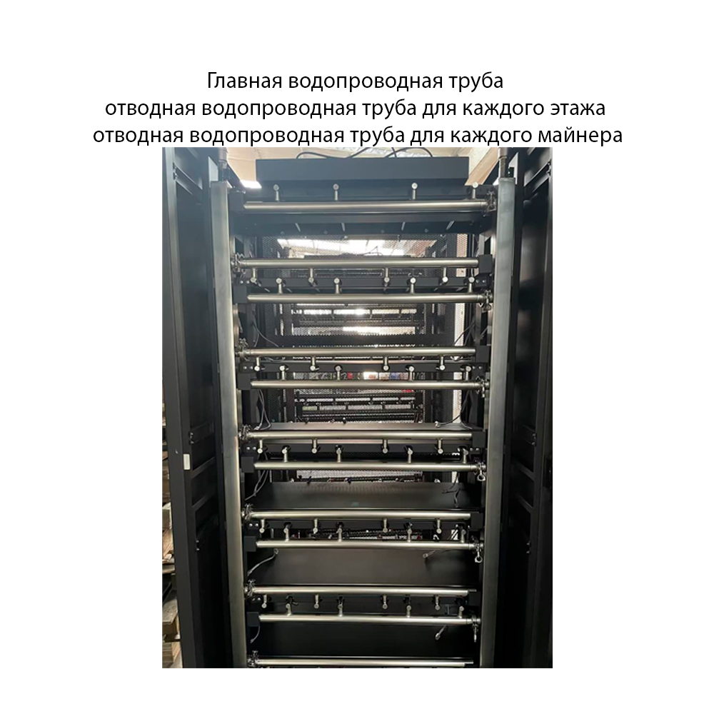Шкаф оснащен магистральным водопроводом, а также ответвлением водопровода на каждый этаж и ответвлением водопровода на каждый майнер. Все характеристики труб был тщательно протестированы и рассчитаны, чтобы гарантировать, что расход воды каждого майнера составит не менее 8 л и обеспечит равномерное давление.