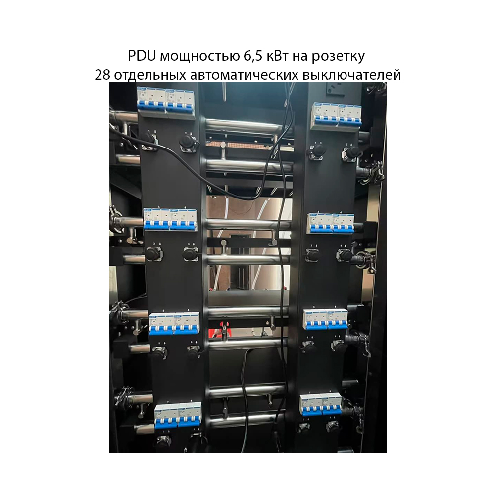 Шкаф оснащен специальным блоком распределения питания PDU с максимальной мощностью 6,5 кВт на розетку и 28 отдельными автоматическими выключателями. Поддержка индивидуальной частоты 50/60 Гц.