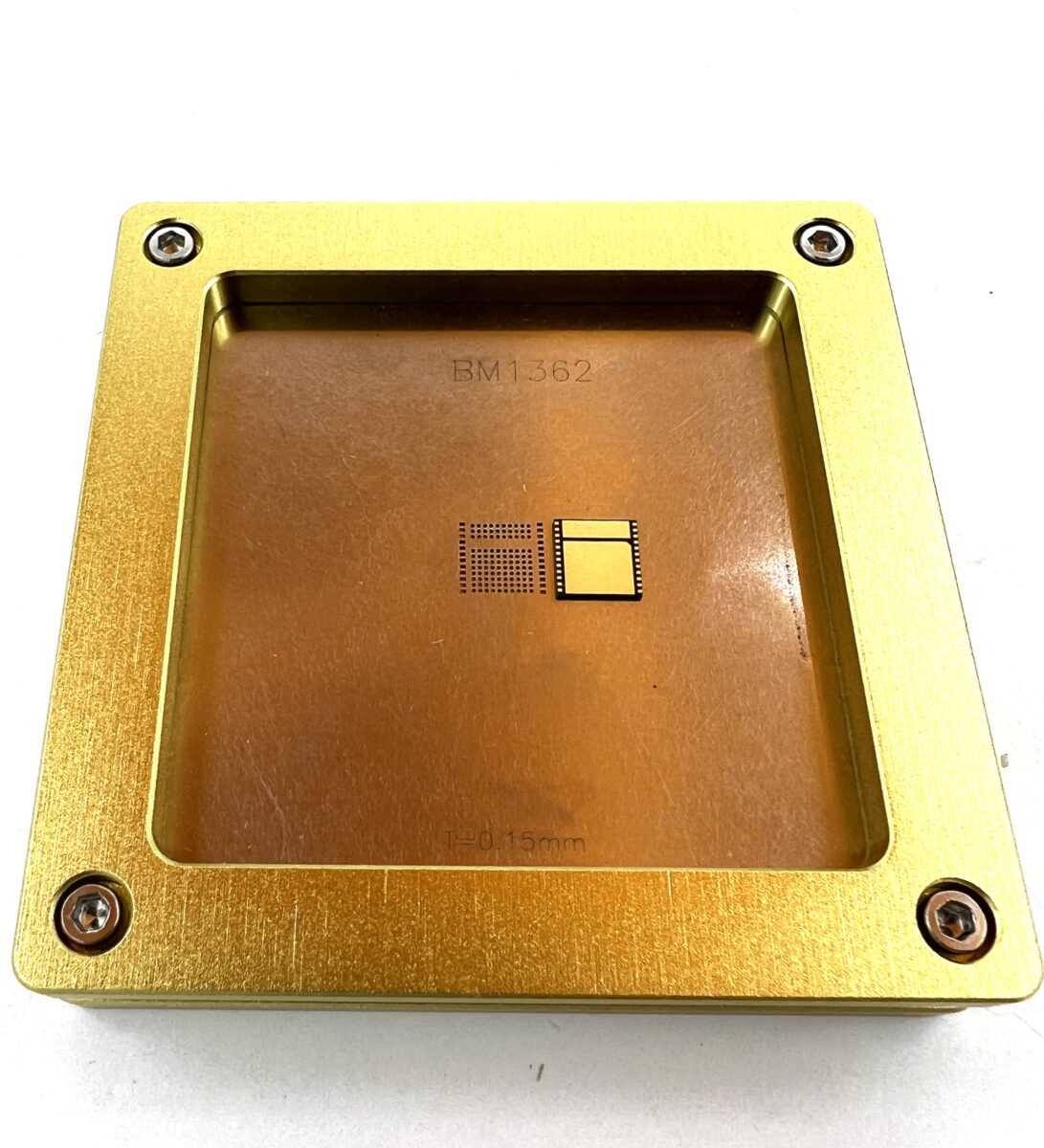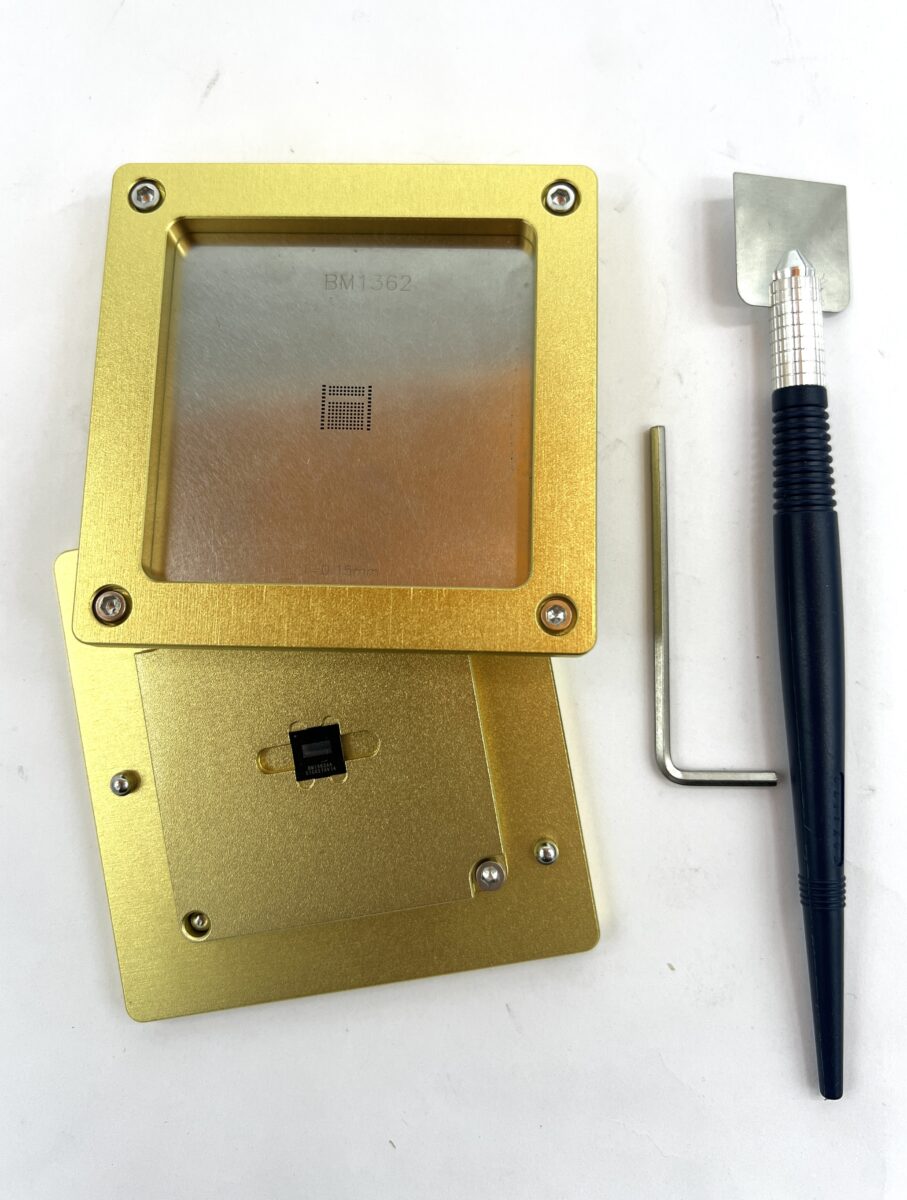 Трафарет S19 для чипа BM1362AK — это высокоточный инструмент, предназначенный для пайки и реболлинга чипов на хэш-платах майнеров серии Antminer S19. Он обеспечивает точное позиционирование припоя на контактных площадках чипа с 12 ножками, что критически важно при ремонте и восстановлении плат.